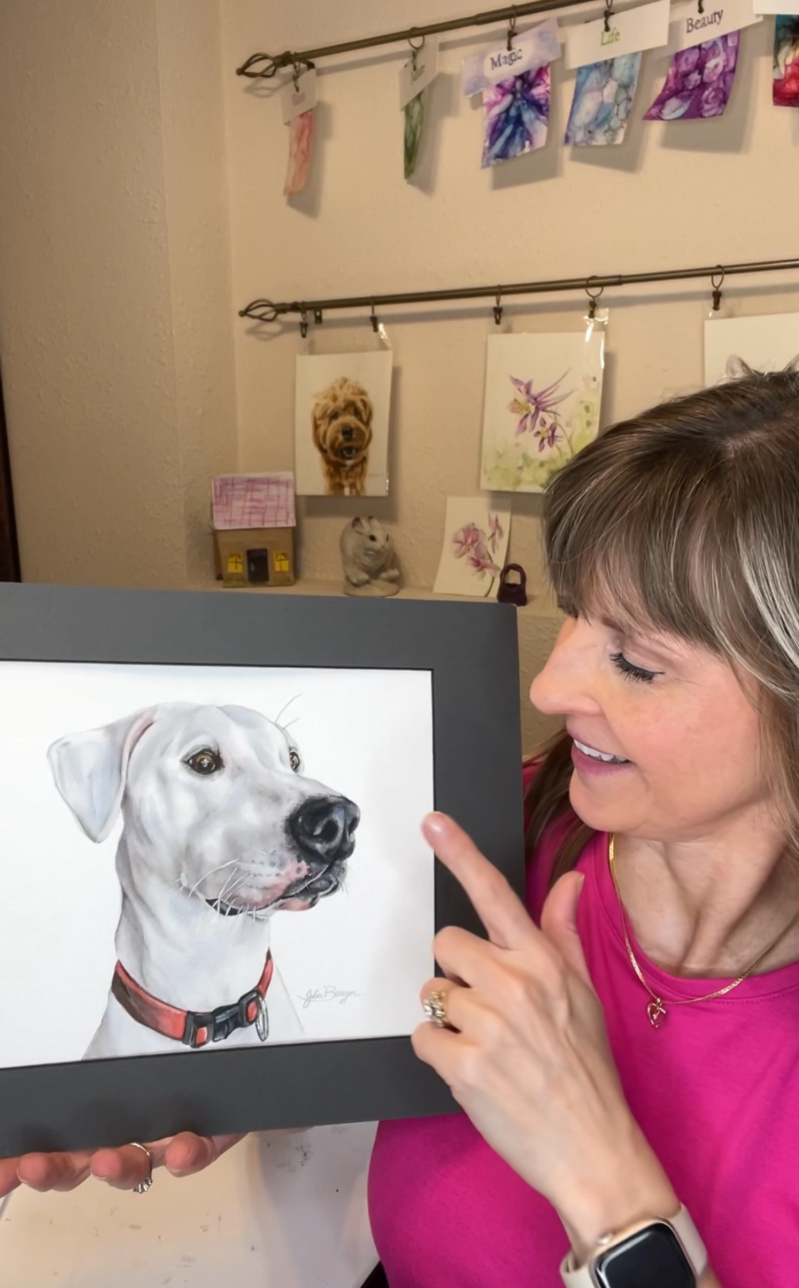 One of the things I’m best known for is my custom pet portraits. I work from photos and try to really capture each animal’s personality — not just what they look like, but the spirit behind their eyes. I’ve had people tell me they cried when they opened their portrait, and that’s always the highest compliment.