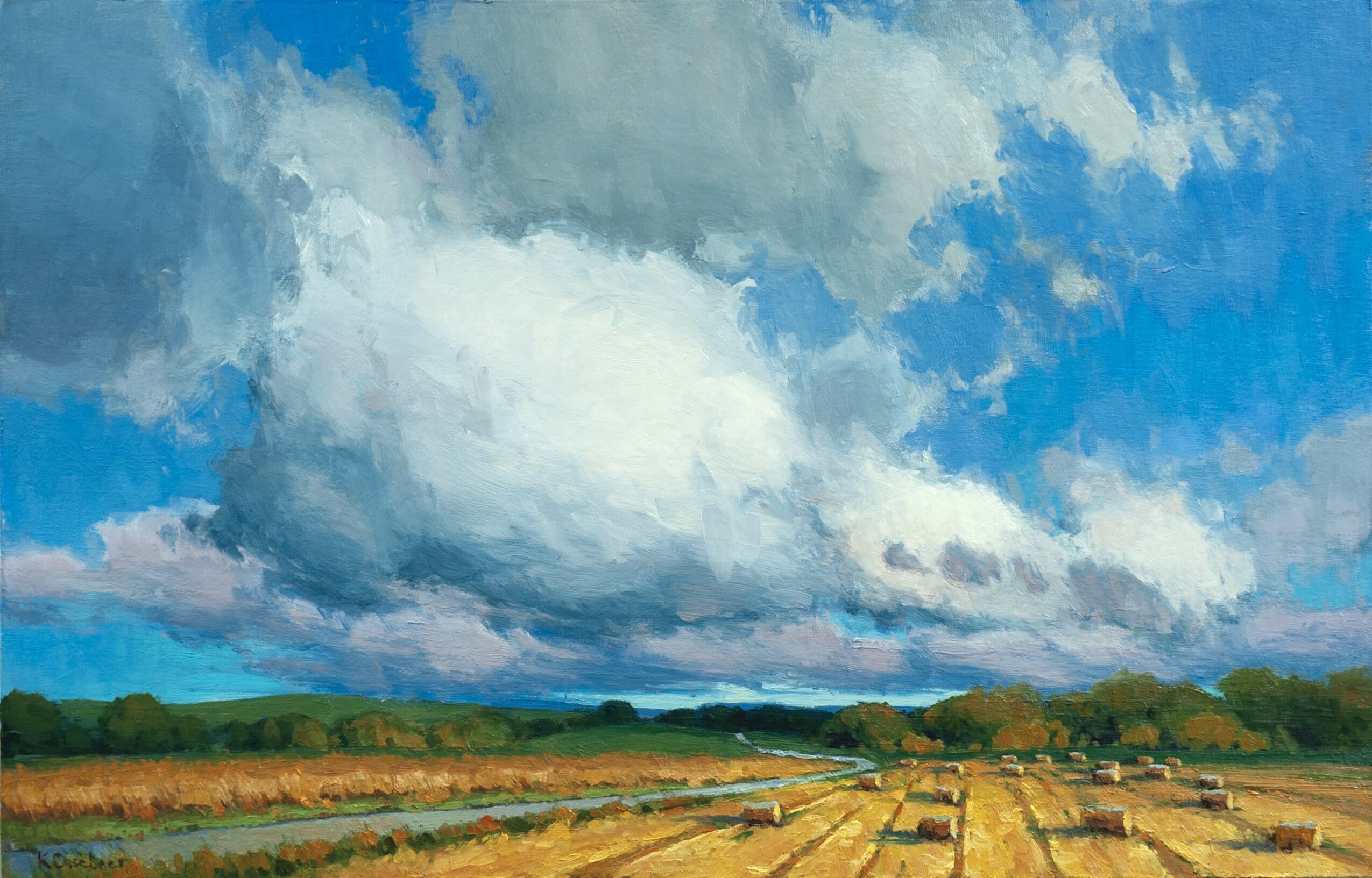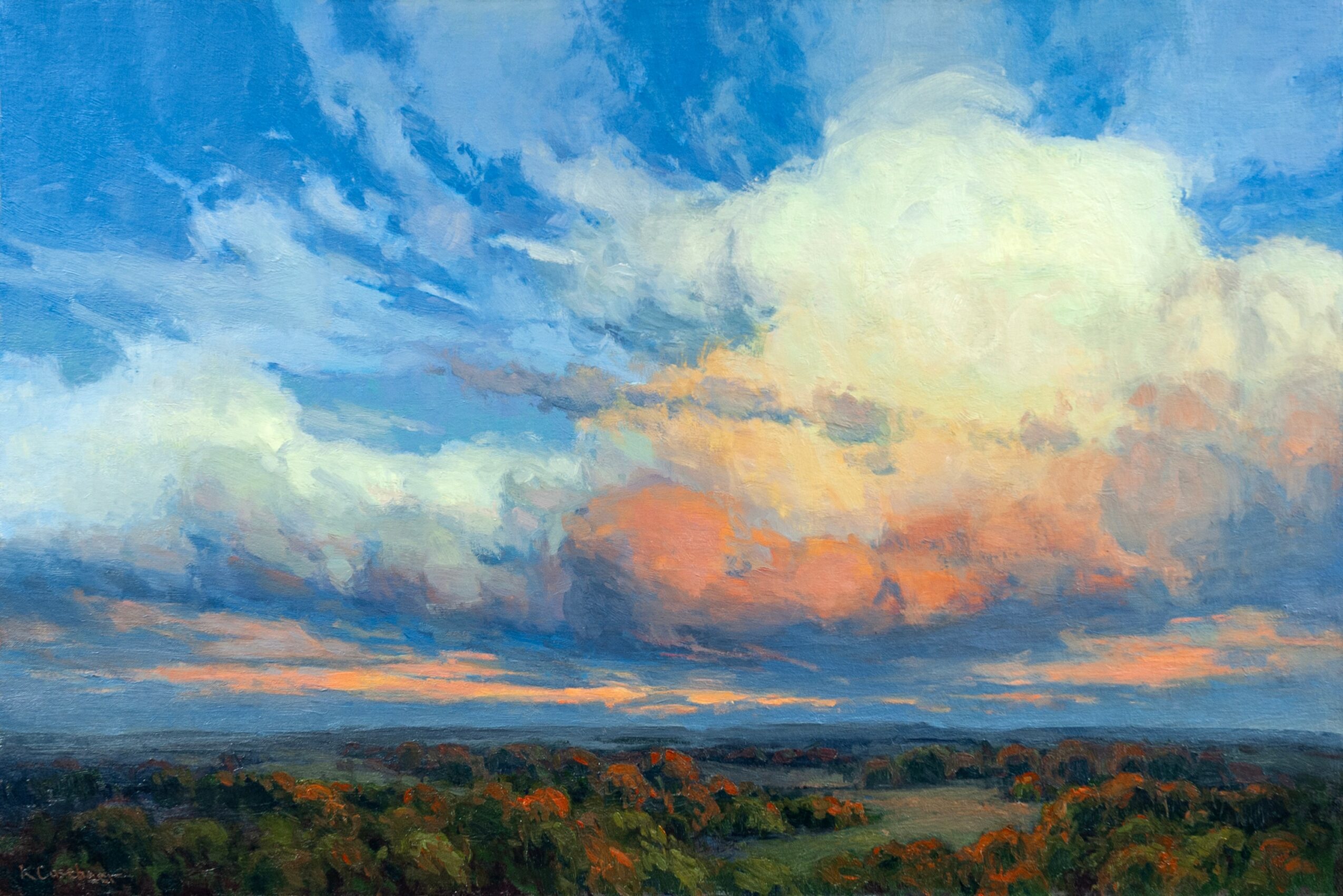 I specialize in painting the pure, rural landscape. In the midwest that is the mostly unaltered, flint hills, and the big, open skies. In the west, that is the big vistas of mountains and skies. I’m most proud of my ability to capture these places so the viewer feels connected to them in an emotional way. Most often this means focusing on the light and shadow effects in the landscape. This ability is two fold. First, it comes from my many years of experience painting the landscape en plein air, which means painting outside on location from life. An artist can’t convincingly paint the landscape unless they are spending a significant amount of time outside experiencing the landscape. Next, I bring those plein air paintings in to my studio to use as studies for larger paintings. It’s in these larger paintings that I will push light and shadow effects more in order to create a dramatic landscape.