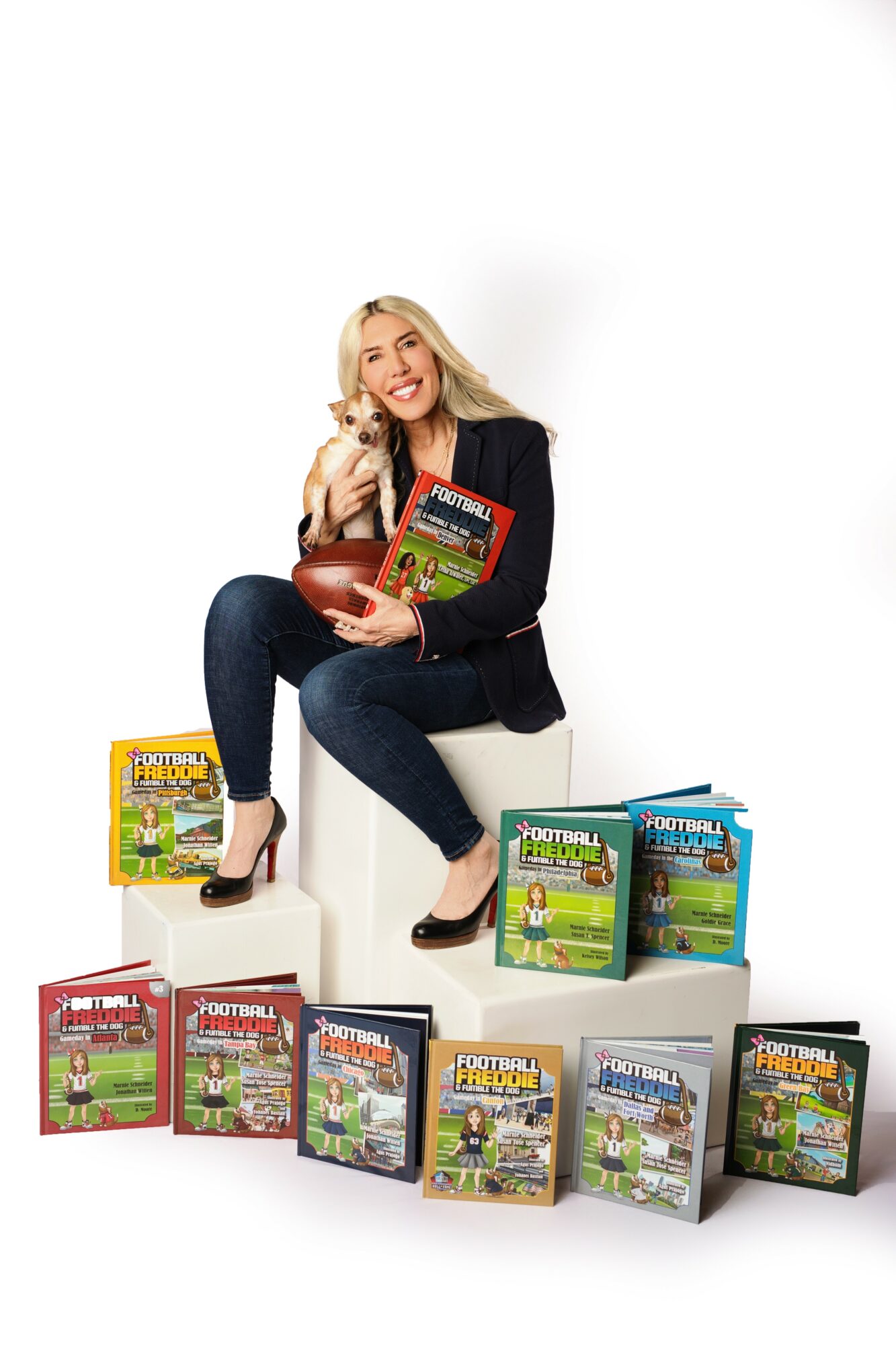 Launching and growing a book series like *Gameday in the USA* required Marnie to wear many hats. Writing for children is a delicate balance of being educational, entertaining, and engaging. Marnie had to research each city featured in her books, from its football history to its culture and traditions, and find creative ways to present this information through the adventures of Football Freddie and Fumble the Dog.