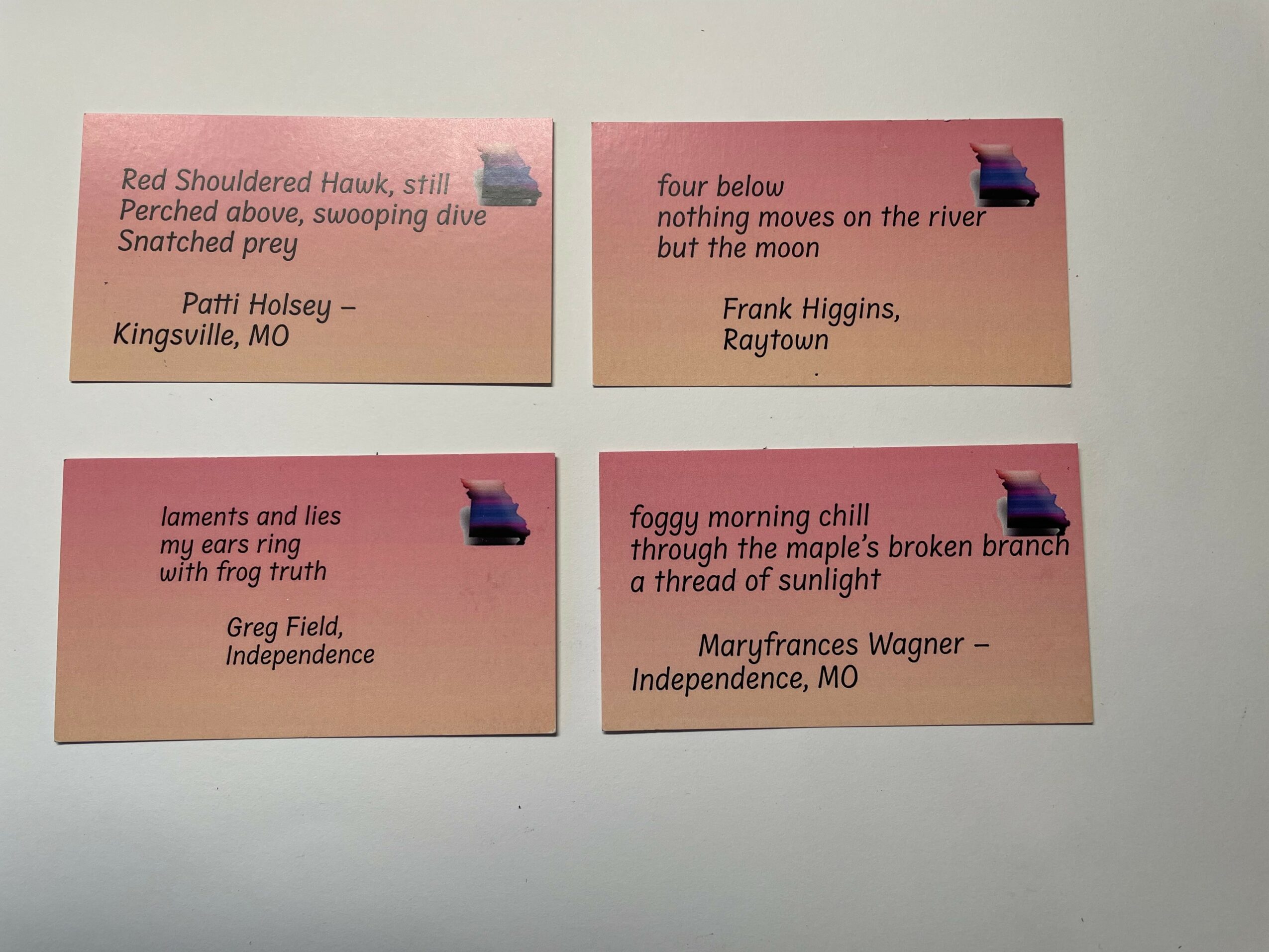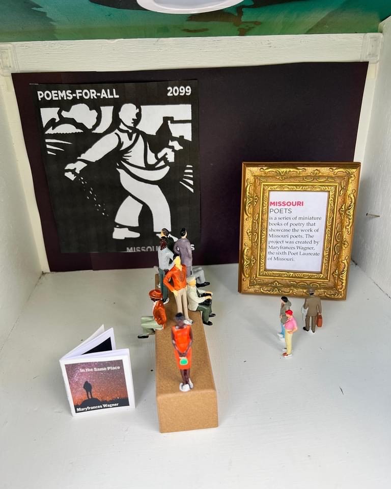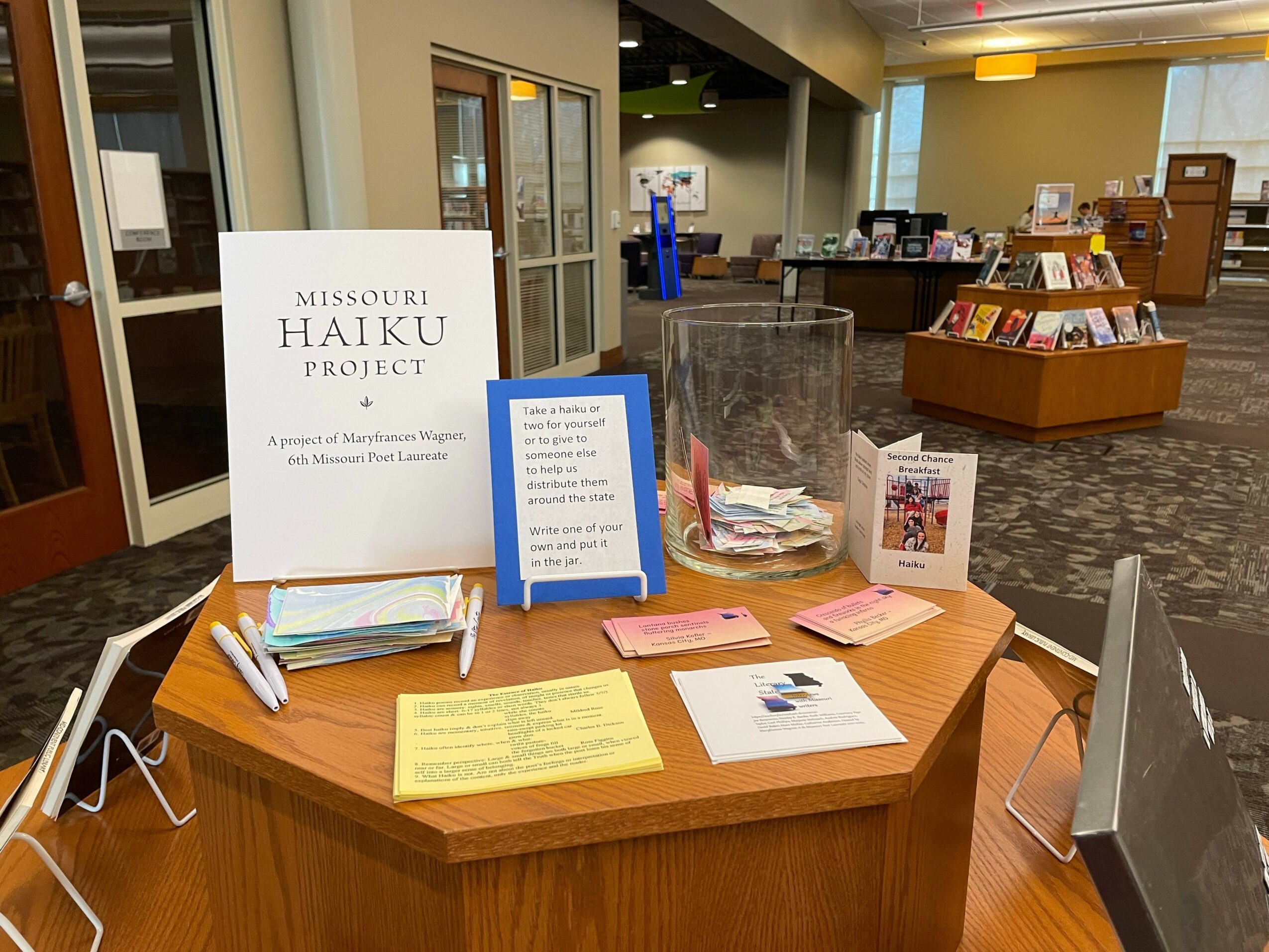 As Missouri Poet Laureate, I read poetry, published a new book, wrote a Missouri poem I delivered at the Capitol, conducted workshops, and delivered keynotes and talks all around the state. Since we were still at the end of the pandemic, I decided to reach people in other ways, so I created some projects. I produced ten podcasts of interviews with Missouri poets on the craft of writing for teachers and those interested in learning more about poetry. I also published two anthologies with Spartan Press and ten Missouri poets featured in each anthology. I had two thousand Tiny Books made–a small booklet that folded out. Each Tiny Book featured one poem by yet another twenty Missouri poets. I distributed a packet of those to each of the poets, and they handed them out around the state. I felt fortunate that I knew so many poets in Missouri who essentially lived in all parts of the state, and I also met many new poets I didn’t know before. My final project was the Haiku Project where I taught haiku workshops throughout the state. Others helped teach them as well. I taught them at festivals, conferences, in schools, in community centers, at The Writers Place, and a teacher in Columbia had students at each grade level write haiku for me as well. We posted daily haiku on Facebook and Instagram, and hundreds of people sent me haiku that I ultimately had professionally printed on cards. A few people wrote at least one a day with me and posted them on Facebook. Some put them on photographs or art they had created. I printed 10,000 haiku cards from those I received from people in every area of the state, every age –from six years old to ninety-five, and they represented a wide diversity. They are still circulating around the state. I always leave either a Tiny Book or a Haiku card for every wait person when I eat out. I hand them out randomly to people who might find them interesting when I walk or standing in line. I’ve given cards to other poets that they hand out as well. My goal during those two years was to get poetry into the hands of people who didn’t think they liked it or didn’t know much about poetry. I had people read them, write them, and share them. If there was a waiting time in a long line or a doctor’s office, I asked people to write them and guided them through the process. When the power went out in my neighborhood, my neighbors called to ask if we were also in the dark, and I told them it was a good time to write a few haiku. I gave them the directions, and a couple of hours later, they send me haiku poems. I also had one hundred of the haiku framed and put up in the Story Center at Woodneath Library. I filled two display cases with books by Missouri poets, haiku cards, pictures from workshops, art and objects that people had put their haiku on, and I set up a table with a bowl for people to write haiku when they came to the library. I also taught two workshops there. Students chalked them on sidewalks and hung them in trees, and planted haiku sticks in parks. In Columbia, there was a haiku high tea at the local library, a tiny gallery of art that people wrote haiku about, and an artist there had a tiny gallery in her front yard and had people driving or walking by stop and write haiku poems to the art inside. At the end, we had a final haiku reading for anyone who had written haiku and wanted to read. I loved my experience and was often filled with zeal and many poignant moments.