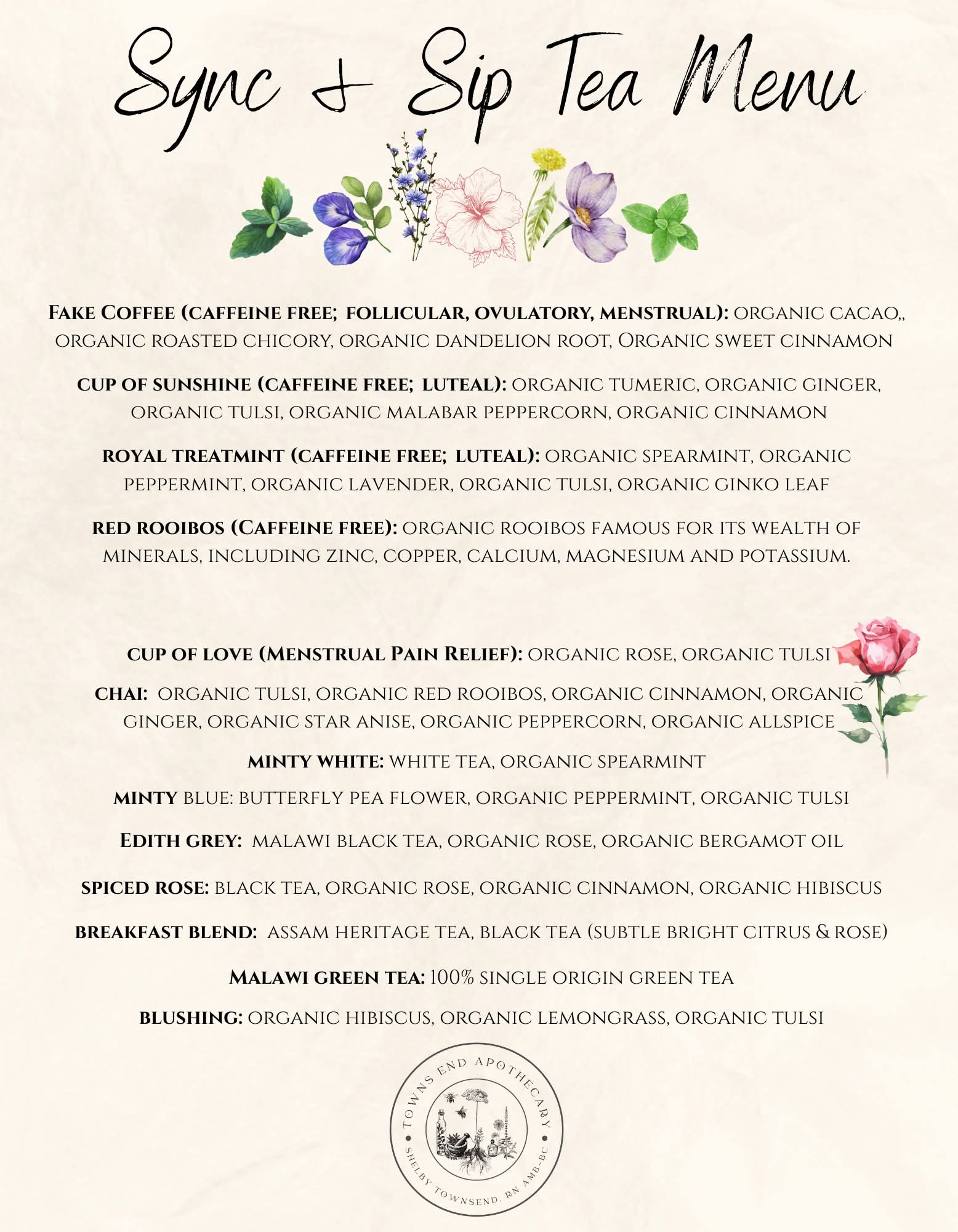 I didn’t always know I wanted to own a business, however, I’ve always had this feeling of being meant for something more….. something bigger. I’ve always had this deep connection with nature and all things living, which is how I fell into becoming a nurse. I graduated nursing school in 2016 as my empathy and passion drove me into helping others heal, and I was really good at it. Fast forward a few years, my husband and I, along with our two boys, move to the country which had been a dream of ours for many years. I’ve always had the most supportive husband and we have the best little family, yet, I still felt unfulfilled. It was like a fire was burning inside of me and I wasn’t doing anything with it. My husband encouraged me to get a hobby, outside of our children, and I fell into plants. I learned everything I could about them. How to propagate, their history, the medicinal benefits, and I began teaching others what I taught myself. My husband and I started gardening (fruits, vegetables, herbs, etc) and after a year or two, I thought…. I should start a business. I threw the idea out to my husband and in typical fashion, he was 100% supportive. As Towns End Garden grew, we began offering edgy plant merch, herbal tea blends and more. It’s important to note that I have been sicker than many people my entire life, but for the last 10 years, I began experiencing anxiety, skin rashes, chronic pain and more. After we had our third son, I developed PMDD (pre menstrual dysphoric disorder) and my physical symptoms were worsening. Despite my nursing experience and education, I looked tirelessly for answers through conventional medicine, only continuing to get worse. After multiple specialists and doctors unable to address my symptoms, I met with a functional medicine practitioner who acknowledged the severity of my symptoms and I had noticeable improvement in only a few weeks. I dove head first into holistic medicine and the cycle syncing method. Within a few months, my PMDD (pre menstrual dysphoric disorder) symptoms were completely gone. I realized then that the universe called me to help others who were experiencing their own medical crisis, specifically women suffering with their mental health. I began hosting “Sync and Sips” where women could come to learn about their bodies and how plants, such as herbal tea blends, heal our bodies naturally. I knew that if someone with my background struggled so much, other people were too. I completed a functional medicine practitioner course and began Towns End Apothecary where I look into the root cause of symptoms and help others heal. I find it so beautiful to see how my body could feel that I was meant for more and the universe aligned it all through nursing, a passion for plants and nature, and my own personal health experiences.