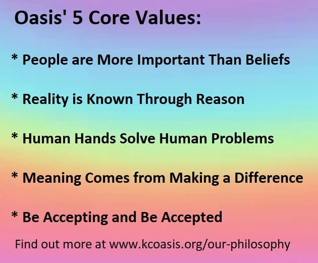 We are known for being the only secular community in Kansas City. There are many atheist and freethinkers groups, which is often confused with secular. Oasis is not anti -religion, just the absence of. Therefore we include people, wherever they are in their beliefs and/or nonbeliefs. We are proud of our charity work and helping to better our local community. We schedule one philanthropy event per month and complete a task for charity every fifth Sunday. We have volunteered weekly beside Christians at Micah Ministeries for over ten years and have forged lasting friendships and understanding.